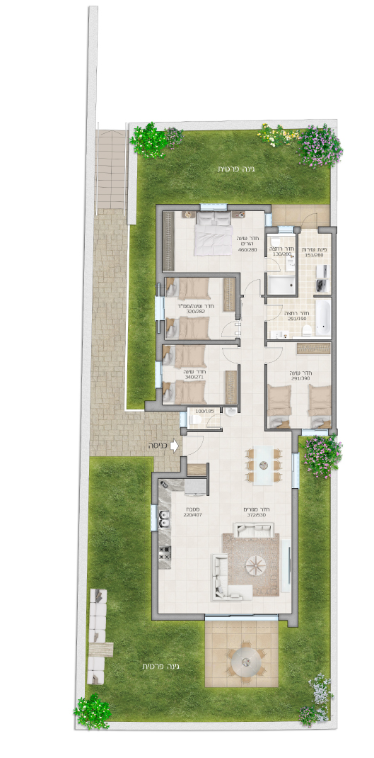 חצר פרטית בהתאם לתכנית פיתוחסכימת מיקום בקומהדירה 2 היא תמונת ראי של דירה 1